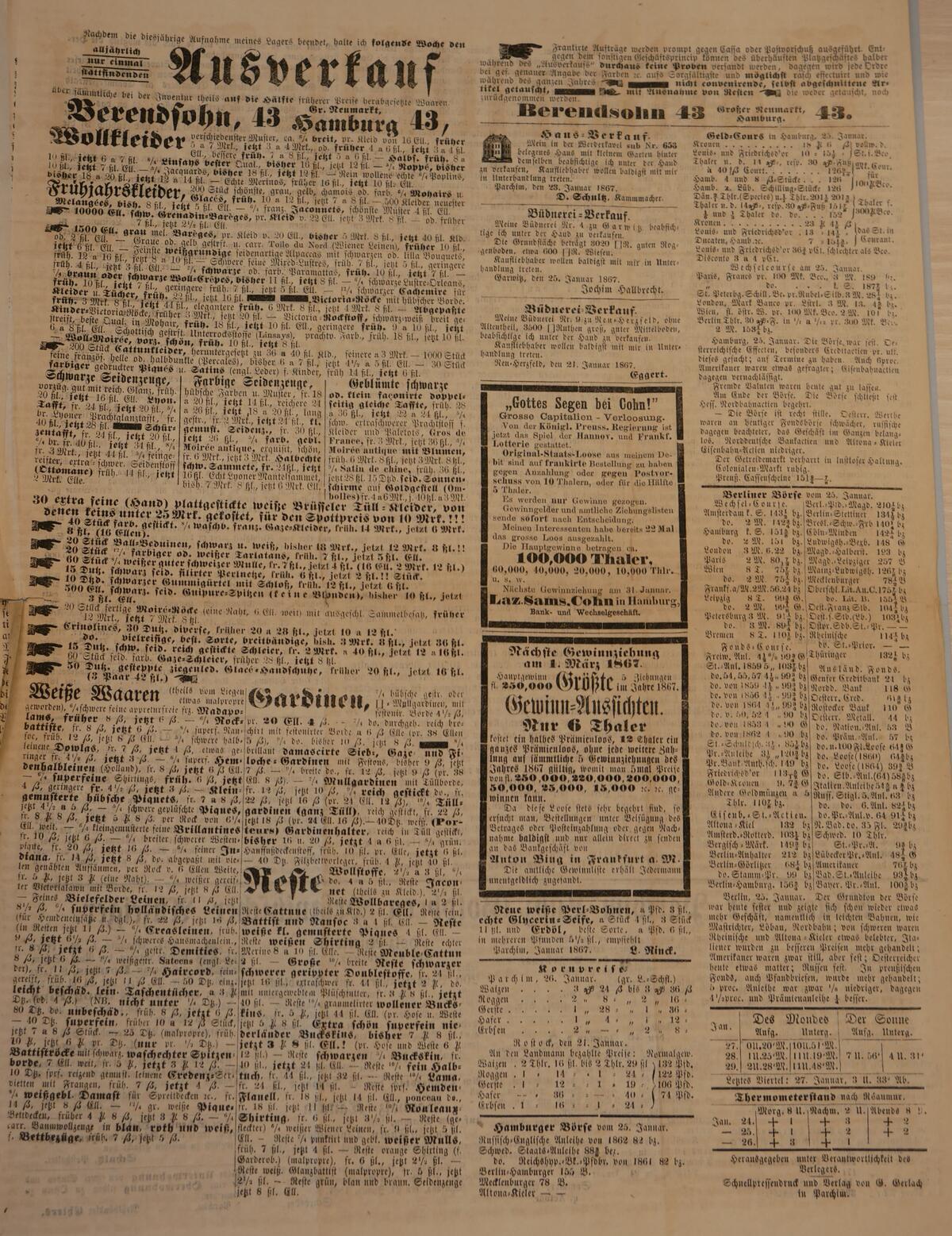 Aus Hamburg, Gr. Neumarkt 43, stammt eine Anzeige zu dem einmal jährlich stattfindenden Ausverkauf des Geschäfts Berendsohn. Die Anzeige nimmt sogar mehr als die Hälfte der letzten Seite ein und geworben wurde mit Rabatten von bis zu 50 Prozent.