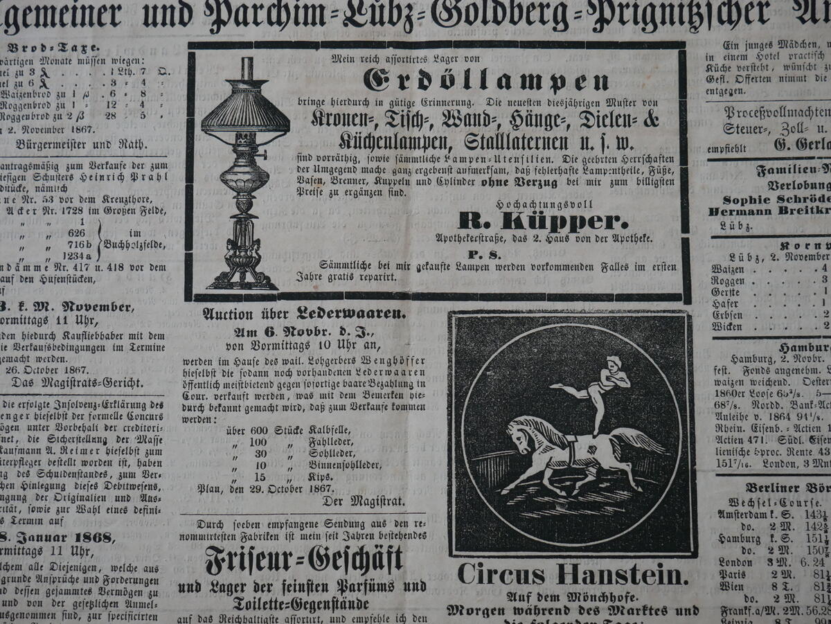 Der Circus Hanstein hingegen lud zu seinen „großen Vorstellungen“ ein, in „der höheren Reitkunst, Pferdedressur und im Seiltanz“. Über dem Artikel ist eine Person auf einem Pferd abgebildet und die Vorstellungen sollten „Morgen während des Marktes und die folgenden Tage“ stattfinden.