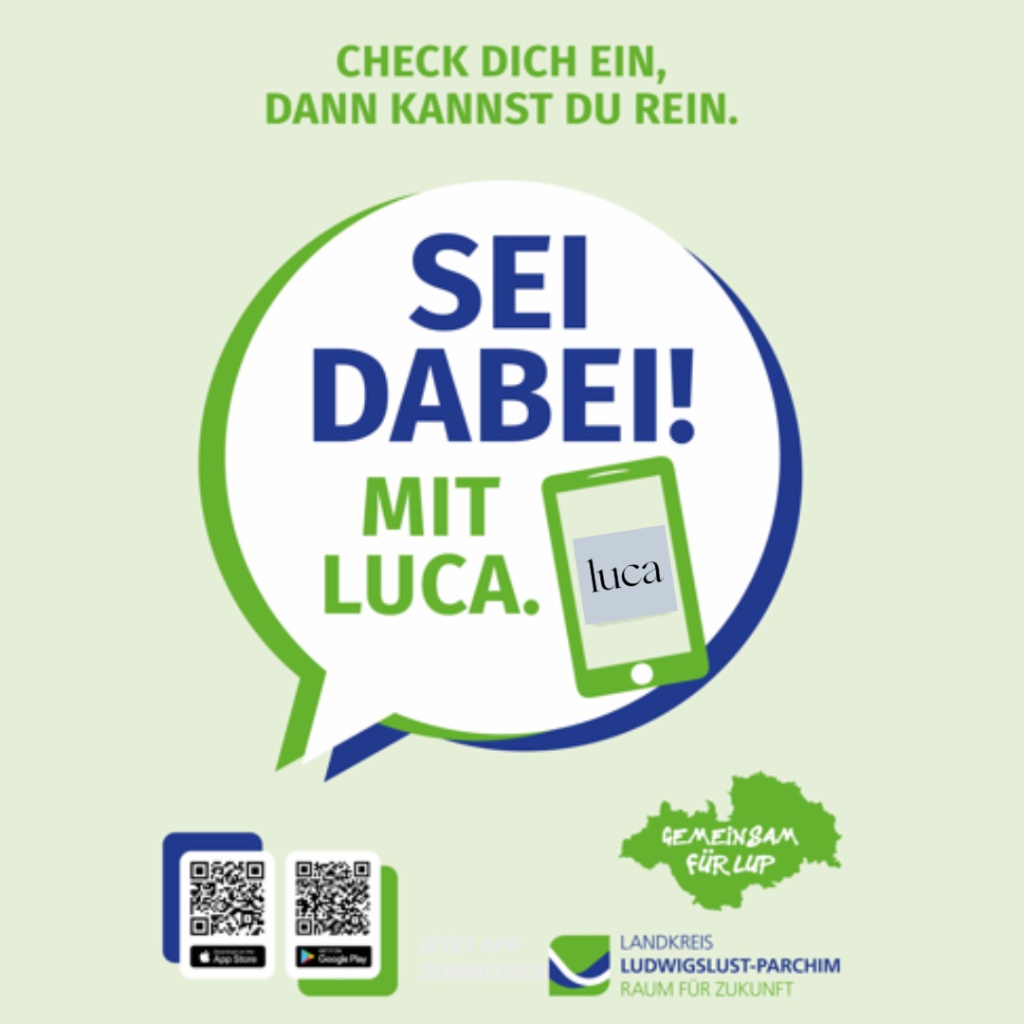 In dieser Woche wurde im Landkreis Ludwigslust-Parchim die Einführung der luca-App vorbereitet. Eingesetzt beim Friseurbesuch, Einkaufen beim Einkaufen oder vielen anderen Gelegenheiten, wo viele Menschen aufeinandertreffen, soll die App bei Infektionsfällen die Kontaktermittlung für das Gesundheitsamt vereinfachen. Aktuell befindet sich die App noch in der technischen Vorbereitung und wird voraussichtlich in der kommenden Woche auch im Landkreis LUP nutzbar sein. der Landkreis veröffentlicht schon jetzt Plakate zur luca-App, die ein einfaches Herunterladen mittels QR-Code ermöglichen (s.u.).